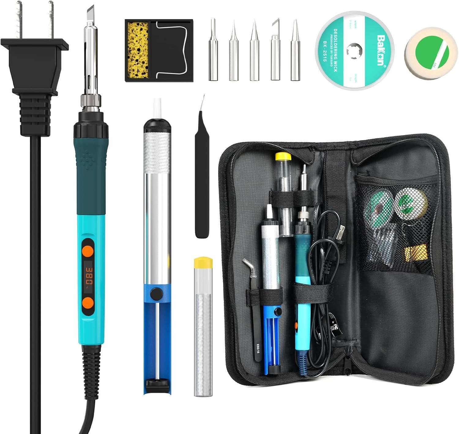 Complete 14-in-1 kit includes soldering iron, desoldering pump, multiple tips, tin wire, wire cutter, tweezers, and more for a full soldering solution.