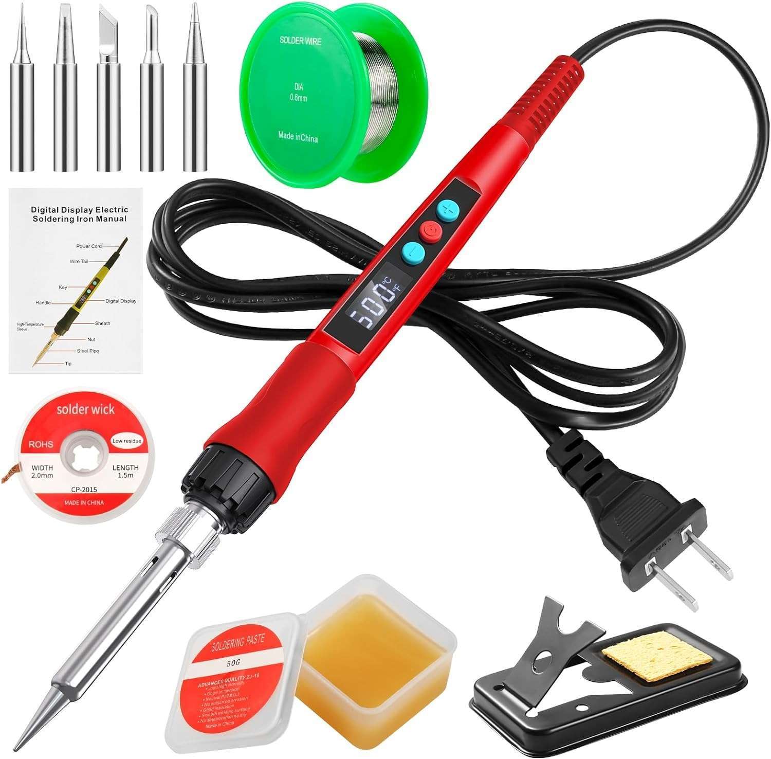 Includes essential accessories like solder wire and tip cleaning sponge.