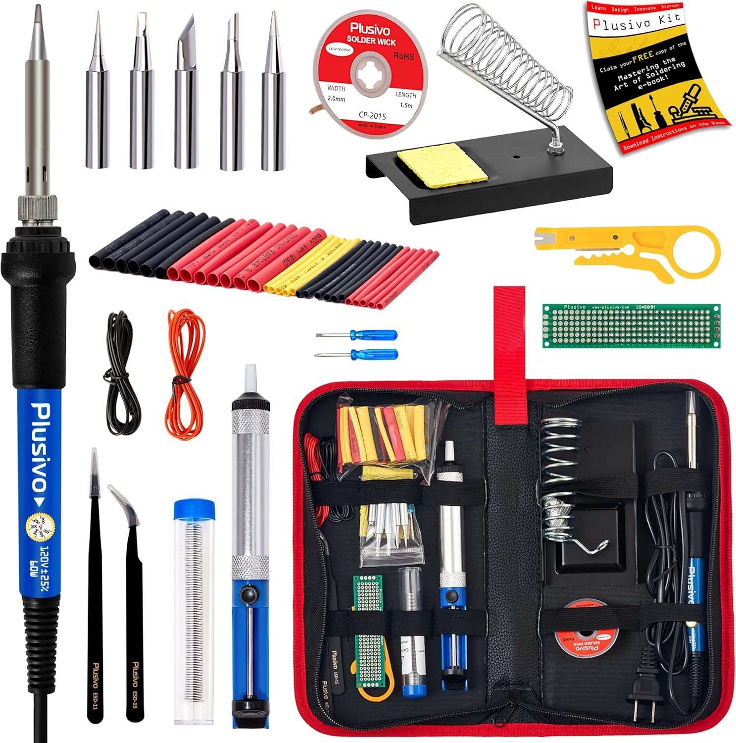 Bonus accessories include desoldering pump, tin wire solder tube, tweezers, mini wire stripper, mini screwdrivers, mini PCB, heat shrink tubes, and more.